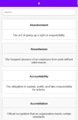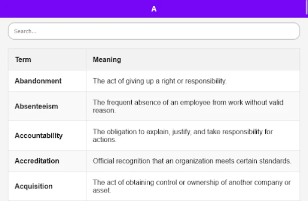 Our app is designed to provide users with a comprehensive collection of administrative terms and their meanings, organized in a convenient A-Z format. Whether you're searching for specific terms related to project management, office administration, or organizational behavior, our dictionary has you covered. With just a few taps, you can access detailed definitions and explanations, helping you deepen your understanding of various concepts.
