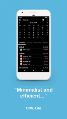 "minimalist and efficient, with seamless syncing of data across devices. It helps users keep track of credit cards, bank accounts, loans, and debts through graph reports, and allows for customizable budgeting categories that can be viewed per week, month, quarter, and year, among others."