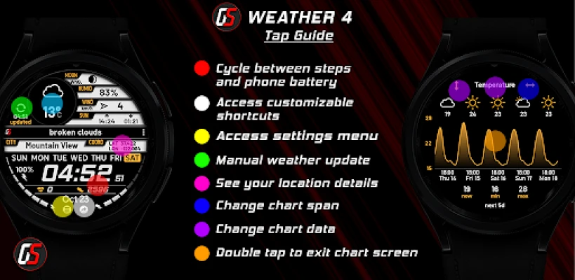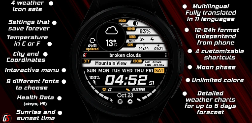 GS Weather 4 is an advanced weather watch face for Wear OS smartwatches with unique features and extreme customization, fully translated into 11 languages.