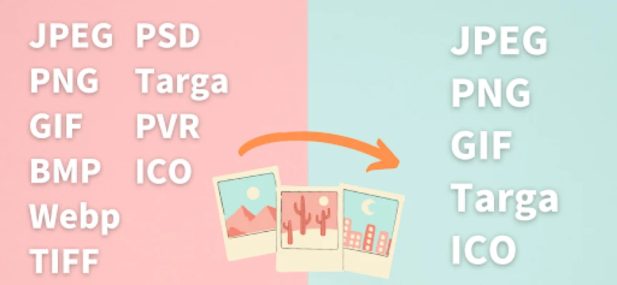 JPEG, PNG, GIF, BMP, WebP, TIFF, PSD, Targa, PVR, ICO, HEIC, HEIF