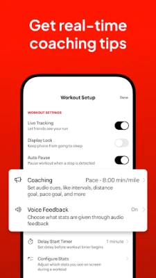 - Real-time audio coaching with updates on pace, distance, duration, and elevation