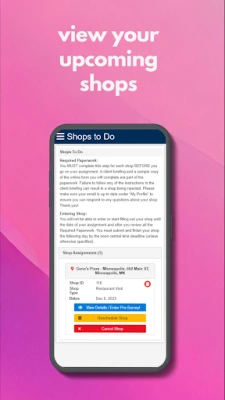 With this app you can: 1. View and schedule available shops 2. Review Shop Instructions 3. Get driving directions and turn-by-turn navigation to the shop location 4. Take and upload digital images to shop reports using your Smartphone’s camera 5. Work between all your devices seamlessly 6. Submit completed shops to get paid 7. Send emails to a coordinator about scheduling shops or support 8. Search for shops based on your location