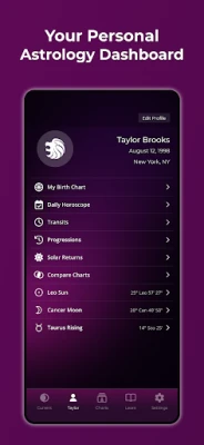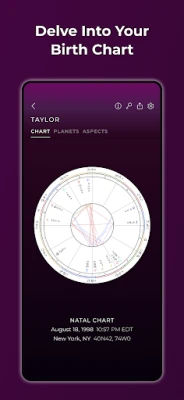 * Explore your Birth Chart with descriptions of each planetary placement and aspect.